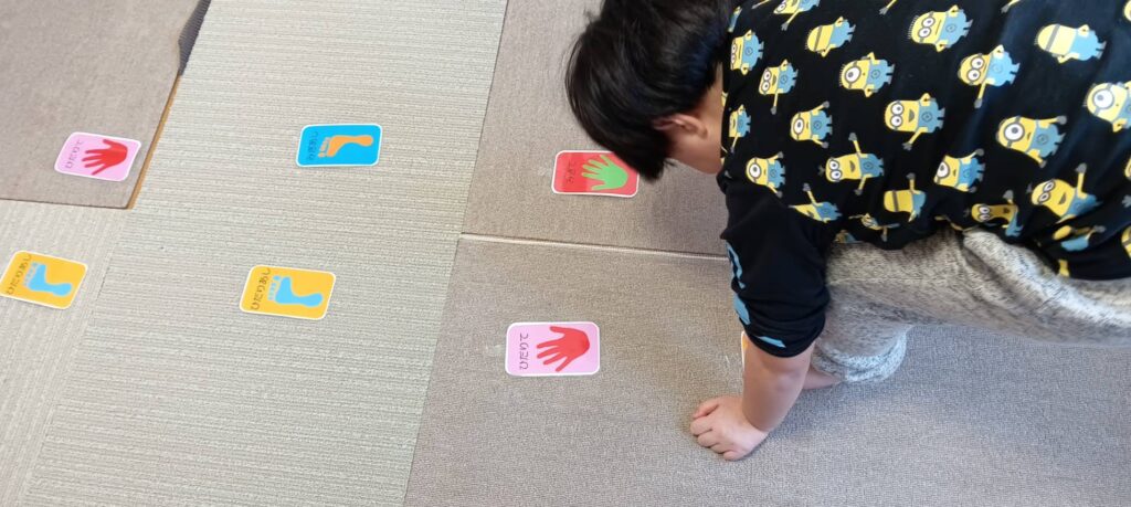 初めは手のみで行いましたが、「左手」「右手」の理解も含めて行うと小学校のお友達は認識していますが、未就学のお友達はまだ難しい様子が見られています💦