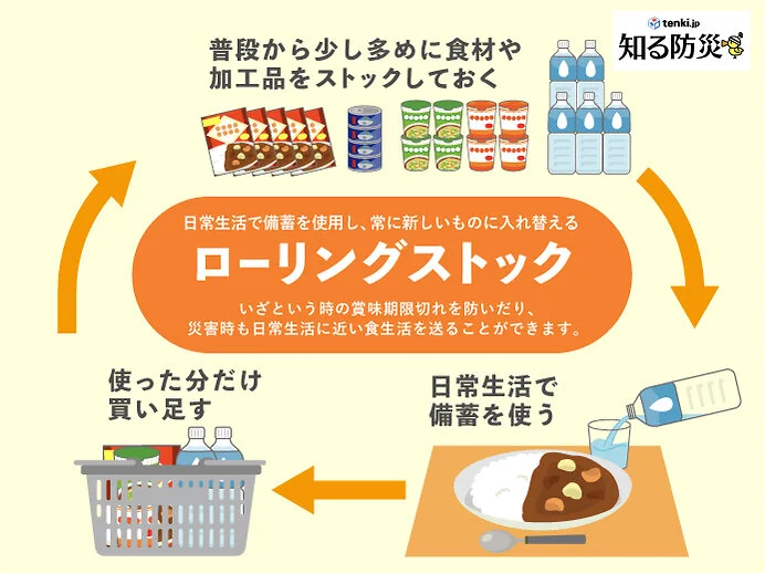 備蓄する食料品は、必ずしも長期備蓄用の保存食でなければいけないわけではありません。普段から少し多めに食材、加工品を買っておき、古いものから使い、使ったら新しく買い足していくことで、常に一定量の食糧を家に備蓄することが可能です。(ローリングストックといいます。)