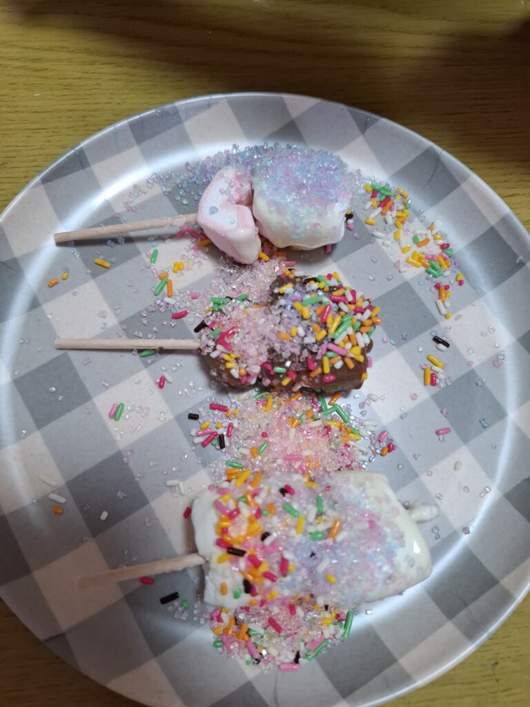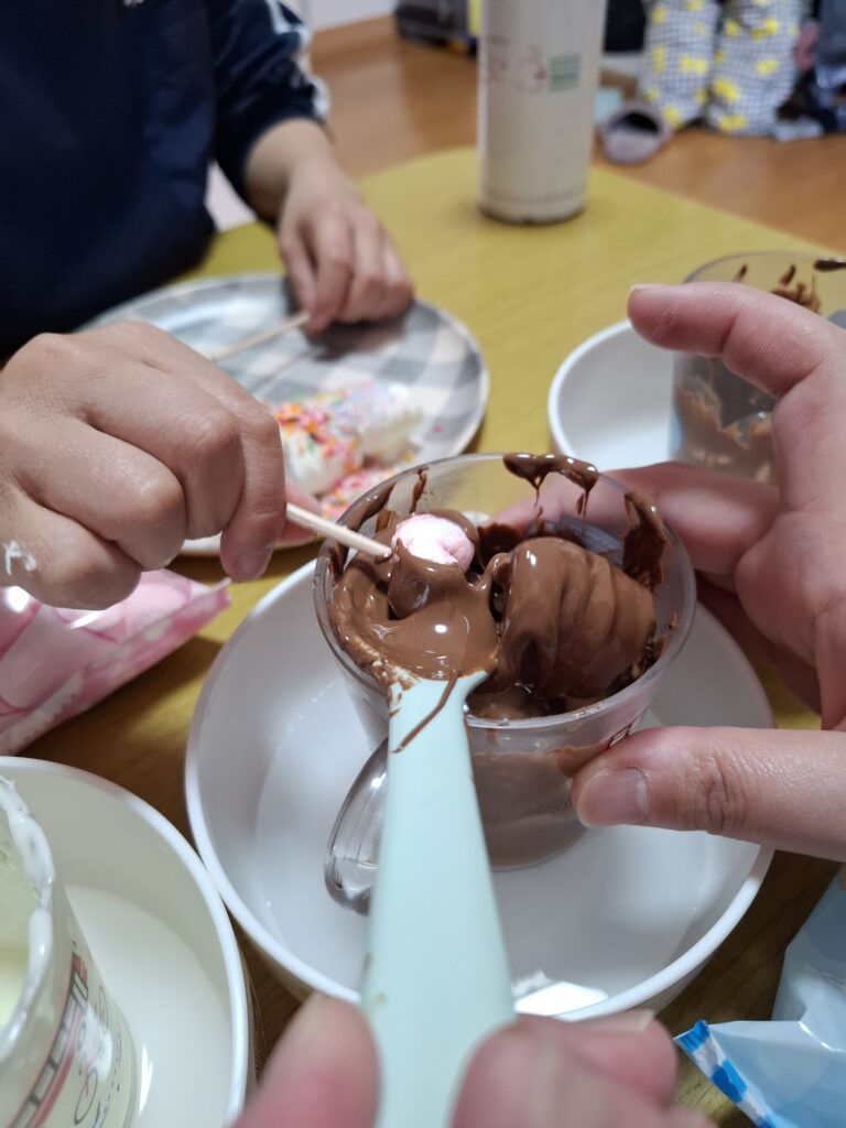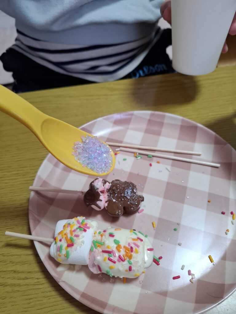 マシュマロにチョコレートをつけてカラースプレーでデコレーションをしました☺️マシュマロにチョコをつける工程が少し難しかったようでしたが、やっていくうちに上手につけることが出来るようになっていました✨
