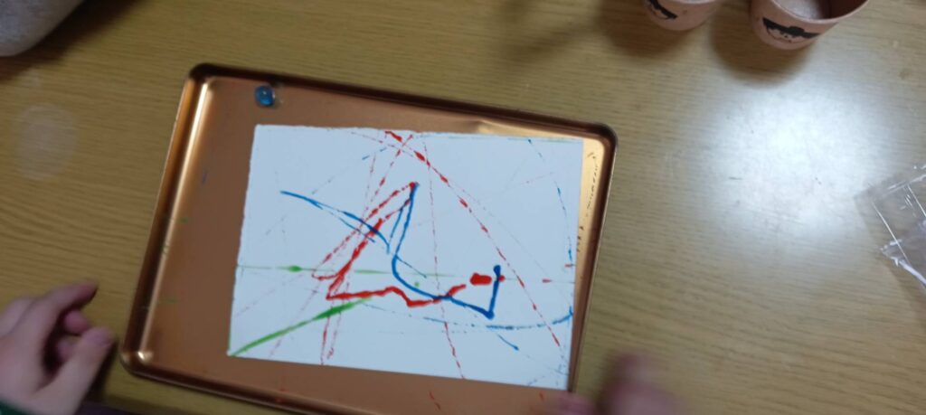 それぞれに好きな絵の具を選んでビー玉に色を付けた後、紙の上に色付きビー玉を転がして線を描きます✏️箱の中でビー玉を転がしながら手を動かし、動く方向で違った模様になるため太い線や細い線で繊細さが表現できたと思います✨
