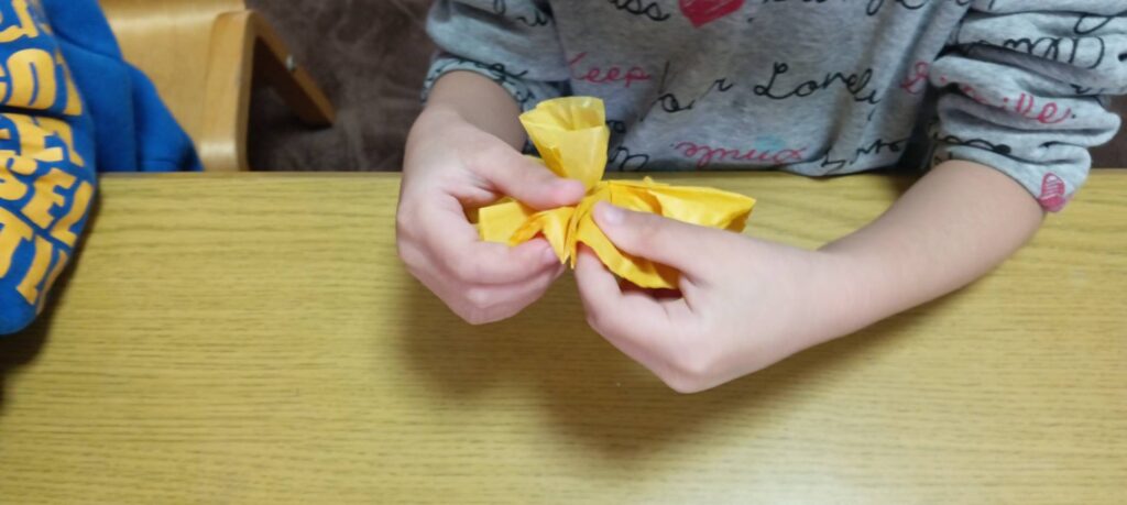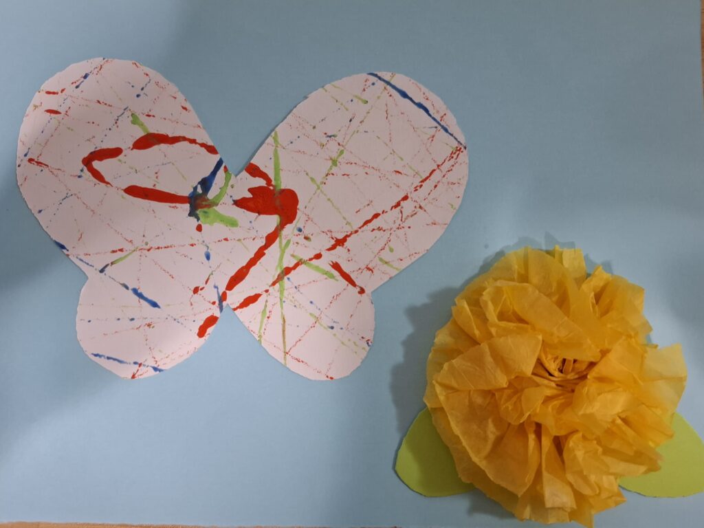 「ちょうちょ」は、ビー玉に絵の具をつけて転がして線を描く“ビー玉アート“と「たんぽぽ」は、お花紙を束にして開きお花のように作りました😊